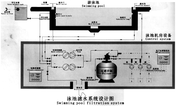 泳池回水從主回水格柵先經(jīng)毛發(fā)聚集器,循環(huán)泵將水中毛發(fā)、大的懸浮物截留住,以免毛發(fā)纏繞泵的葉輪,影響后繼設備運行。出水加入混凝劑后,在管道內(nèi)發(fā)生混合反應,將水中微小懸浮物凝聚,產(chǎn)生花經(jīng)高速過濾器后襯過濾截留。后經(jīng)過換熱器,池水部分加熱后,與另一部分混合。此時加入消毒劑,以殺滅水中細菌,保持一定的余氯量,并加入除藻劑,避免池水發(fā)綠,并調(diào)節(jié)PH值,然后池水重新回到泳池。以上是成熟的游泳池循環(huán)水處理工藝。