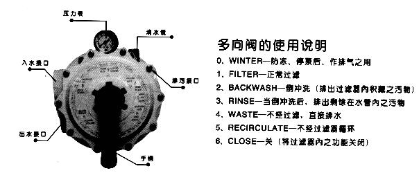 7、砂缸頭多向閥的使用說明:(詳見下圖)