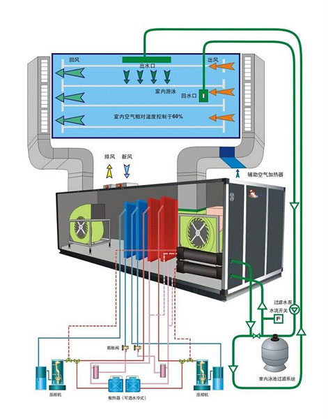室內(nèi)泳池恒溫除濕熱泵流程圖