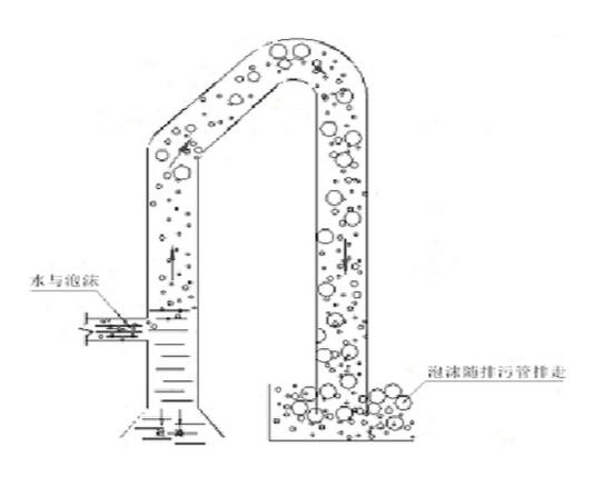 隨著過濾過程的進(jìn)行,污物在濾料層中不斷積累,濾料層內(nèi)的孔隙由上至下逐漸被堵塞,水流通過濾料層的阻力和水頭損失隨之逐步增大,水頭損失增大的同時(shí),虹吸系統(tǒng)的水位就隨之上升。當(dāng)水頭損失達(dá)到允許的最大值或出水水質(zhì)達(dá)到某一規(guī)定值時(shí),虹吸管的水位達(dá)到虹吸管的頂部,這時(shí)過濾系統(tǒng)停止工作,系統(tǒng)進(jìn)行浮選分離和反沖洗工作。反沖洗時(shí),沖洗水的流向與過濾完全相反,這時(shí),水流的方向是從濾池的底部向?yàn)V池上部流動(dòng)。沖洗水的流向是:首先進(jìn)行配水系統(tǒng)向上流過承托層和濾料層,沖走沉積于濾層中的污物和液面上部的油脂污染物。然后排于下水道或沉淀池。沖洗完成后,即可恢復(fù)進(jìn)行下一循環(huán)過程。