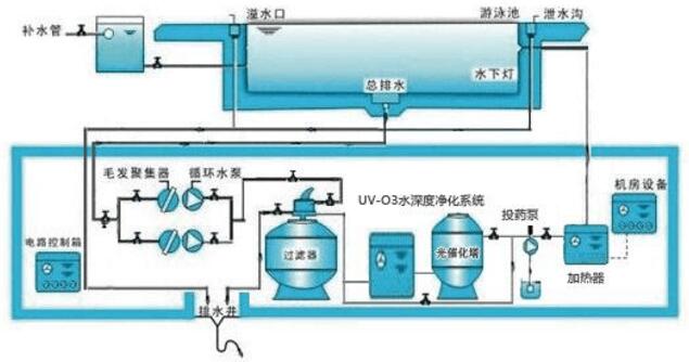 第一步驟:泳池水處理(經過過程物化方法除去水中一些物質的過程)系統及工藝流程水處理系統;泳池水質處理系統從靜態平衡任務事理,在輪回處理過程中達到水質的徹底污染。泳池水經過溢流槽回到平衡水池,會同補水一同進入回水管線,在回水泵驅動下流經毛發聚集器并濾除毛發和顆粒雜物;而加入絮凝劑,在打泳池水循環系統。