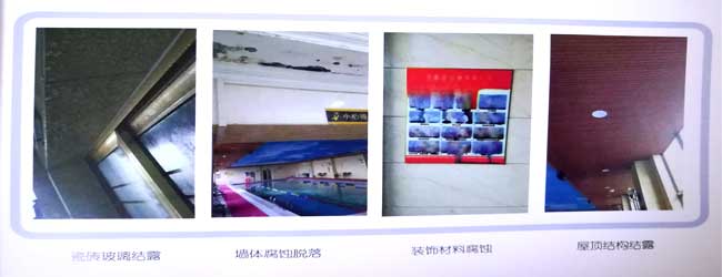 室內泳池蒸發水汽中含有大量游離氯分子,吸附在建筑物上金屬結構材料的表面,使金屬表面的保護膜破壞,在通過水的化學反應導致金屬結構腐蝕。