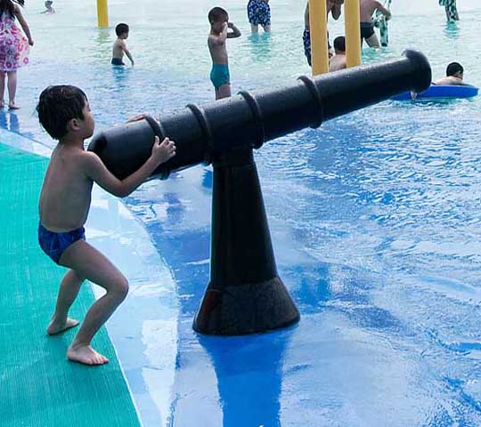 水炮上有一個機關,按下去就會射出一條長長的水線。深受大小朋友歡迎的戲水設備。